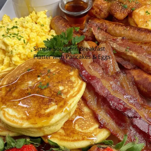 A Simple Southern Breakfast Platter with Pancakes & Eggs is the perfect way to start the day with comfort, warmth, and satisfying flavors. This classic Southern-style breakfast brings together fluffy buttermilk pancakes, creamy cheesy grits, soft scrambled eggs, savory beef sausage, and fresh strawberries. The combination creates a balanced plate with both sweet and savory elements, making it ideal for weekend brunch, family breakfasts, or special occasions.
