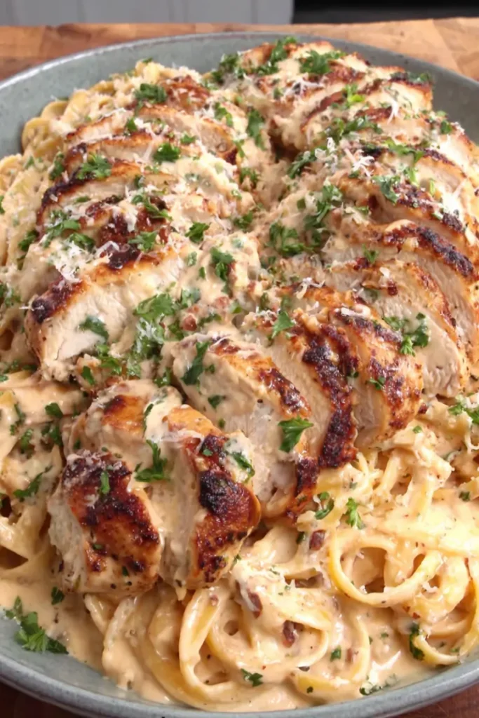 - Divide the pasta onto serving plates, top with sliced chicken, and garnish with chopped parsley and extra grated Parmesan cheese. Serve immediately.