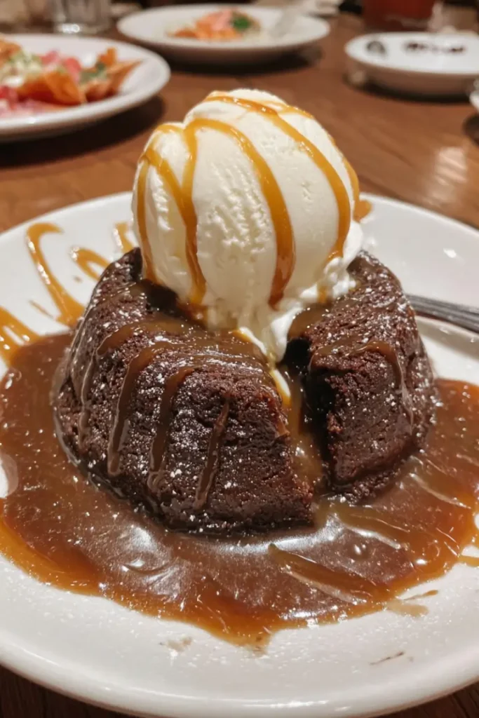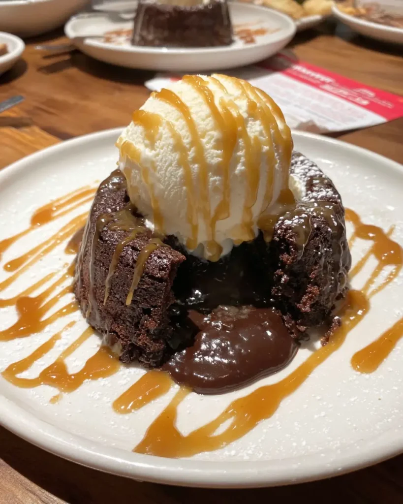 This lava cake is a chocolate lover’s dream. The combination of a soft, slightly crisp exterior with a flowing, chocolatey center creates a luxurious texture in every bite. Pairing it with vanilla ice cream adds a creamy contrast, while a caramel drizzle brings a sweet, buttery note that elevates the dessert even further. It’s: