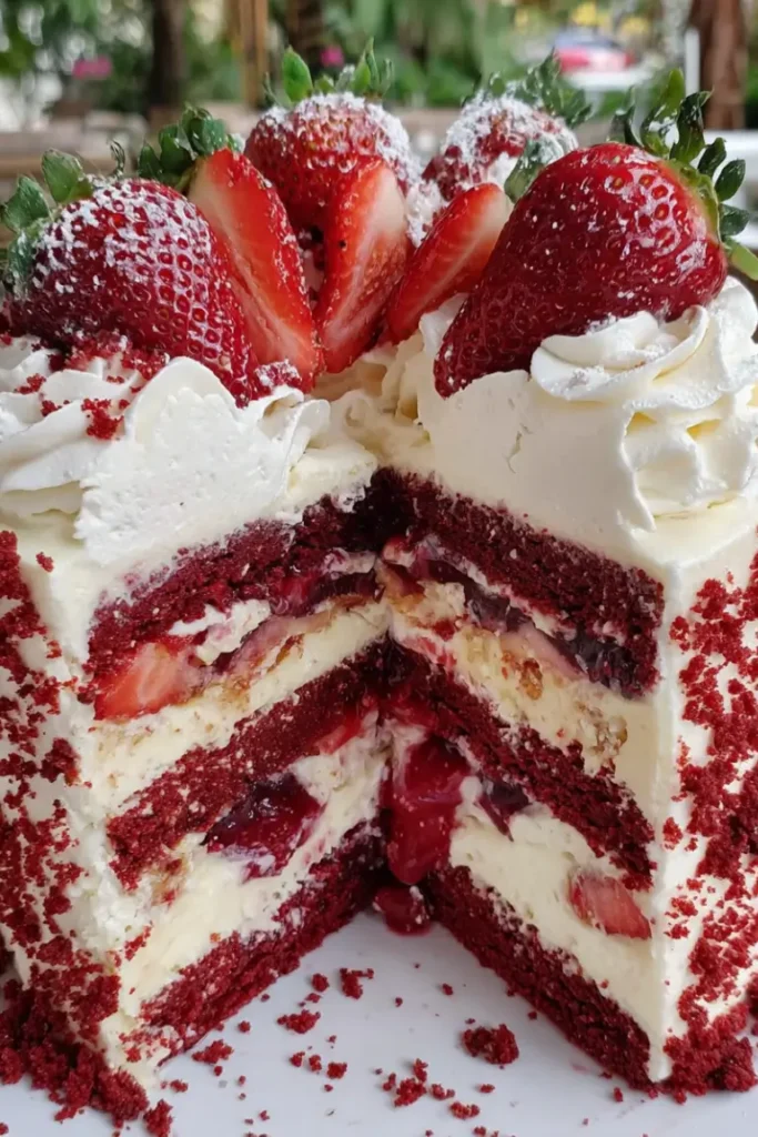 A stunning layered dessert combining a chocolate crust, creamy red velvet cheesecake, fresh strawberries, and fluffy strawberry mousse. This elegant cheesecake is rich, fruity, and perfect for holidays, birthdays, or special celebrations.