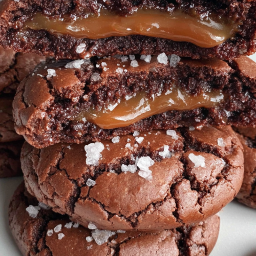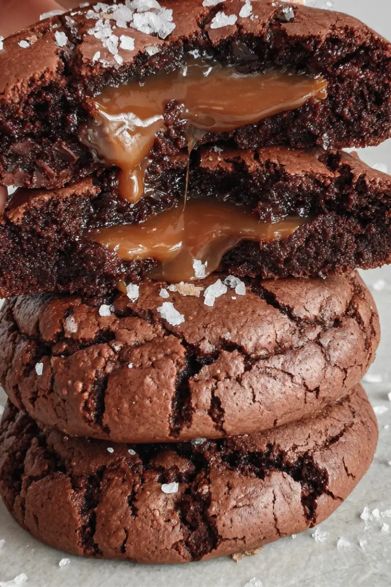 Thick, fudgy dark chocolate cookies stuffed with a molten caramel center and finished with flaky sea salt. These bakery-style cookies strike the perfect balance of rich chocolate, gooey caramel, and sweet-salty contrast.