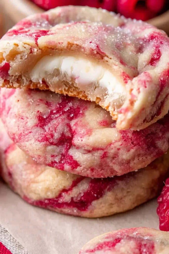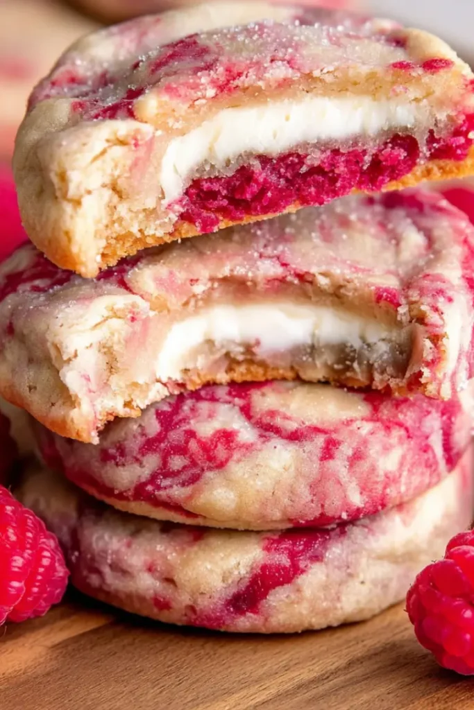 These cookies are not just sweet—they’re an experience. The buttery sugar cookie base gives a soft, chewy texture that perfectly complements the tartness of fresh raspberries. The creamy white chocolate cheesecake filling adds richness without being overpowering, creating a harmonious balance of flavors. With their marbled pink-and-white appearance and a lightly sugared top, these cookies are as visually stunning as they are delicious. Perfect for gifting, parties, or a luxurious weekend treat, they’re bound to impress anyone lucky enough to try one.