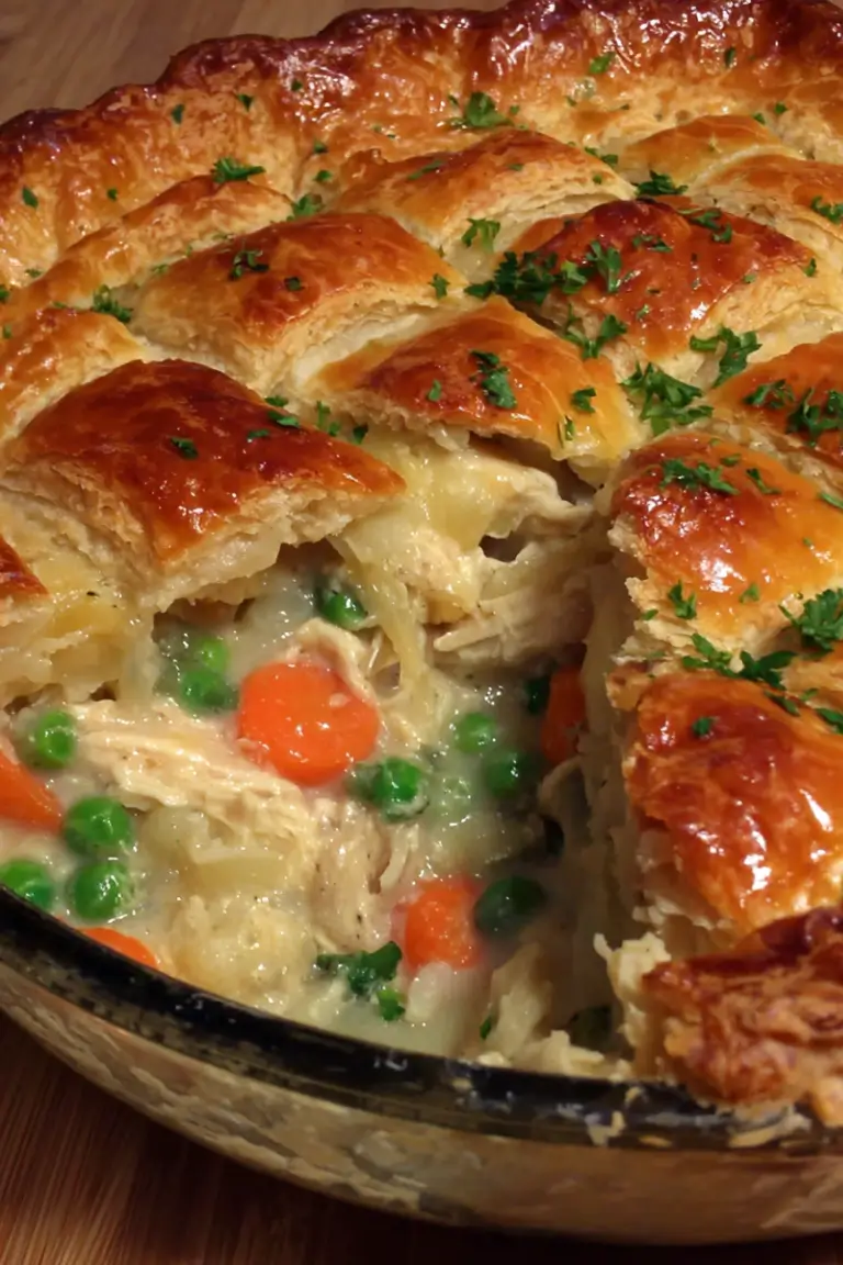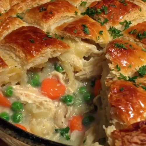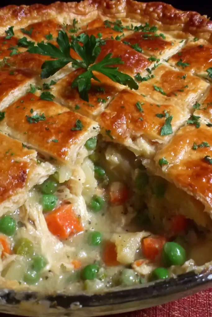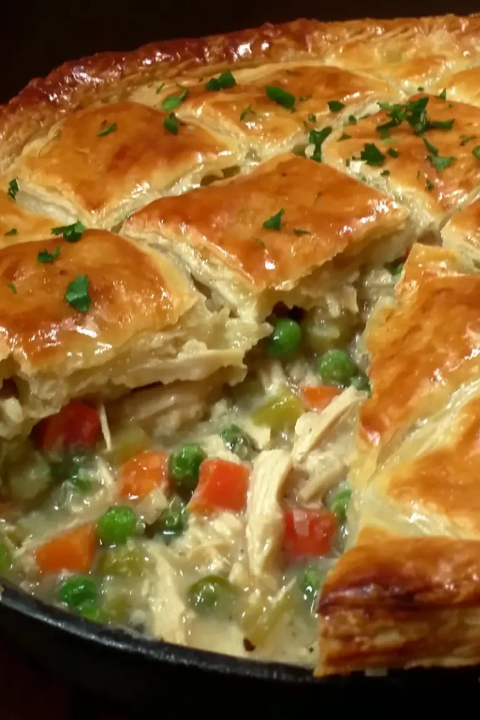 This pot pie is the ultimate weeknight comfort food because it’s hearty, flavorful, and surprisingly quick to make. The filling balances tender chicken, sweet peas, and aromatic vegetables with a creamy, lightly lemon‑kissed sauce. Topped with store‑bought puff pastry, it bakes into a beautifully golden, flaky crust that makes the dish feel indulgent without the fuss. Every bite combines crisp pastry, creamy filling, and fresh herbs for a cozy, satisfying dinner.